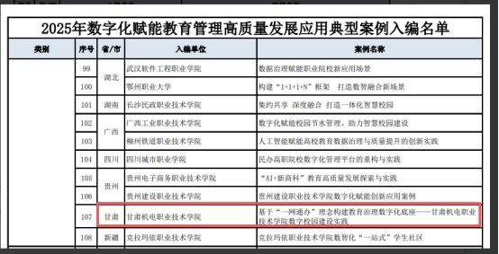 近日,教育部教育管理信息中心公布了“2025年数字化赋能教育管理高质量发展应用典型案例”遴选结果。在全国130个入选案例中,甘肃省占据4席,我校成为甘肃省职业院校中唯一获此殊荣的应用典型案例。