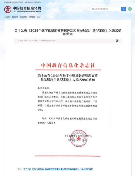 这标志着我校在获得“甘肃省智慧教育标杆校”的基础上,其数字化校园建设的探索与实践进一步获得了国家教育主管部门的高度认可。此案例将为职业教育高质量发展提供具有参考价值的现实范例,供全国教育系统内部交流借鉴。此次入选案例被《中国教育信息化》杂志收录,该杂志是由教育部主管、教育部教育管理信息中心主办的综合性教育类学术期刊。